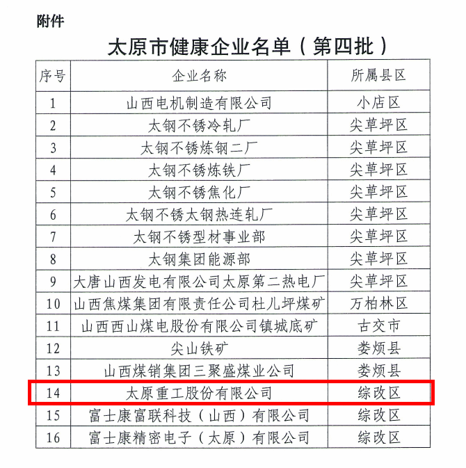 近日,太原市健康委員會公布了第四批健康企業(yè)名單,太原重工股份有限公司憑借卓越的健康管理理念和實踐成果,成功獲評太原市“健康企業(yè)”稱號。